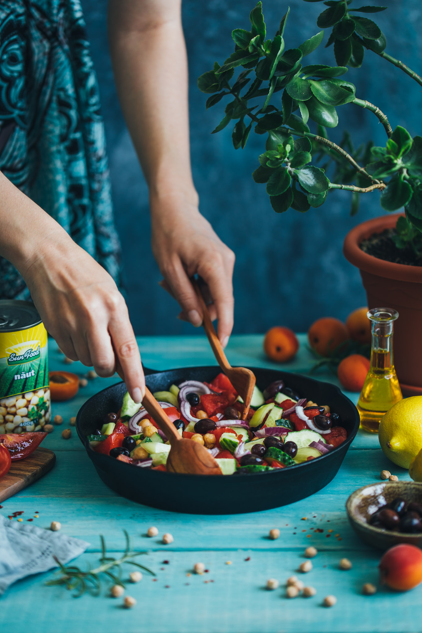 Tăiați roșiile, ardeiul și castravetele cubulețe. Tăiați ceapa rondele. Așezați legumele împreună cu năutul din conservă (scurs de lichid) într-un vas termorezistent, eu am folosit o tigaie de fontă care mi-e foarte dragă. Adăugați măslinele, uleiul de măsline (păstrați o ligură de ulei și pentru feta), puneți mirodeniile, puteți adăuga și două crenguțe de rozmarin proaspăt. Puneți feta deasupra, puneți o lingură de ulei de măsline deasupra ei, presărați busuiocul și oregano uscat peste feta, eu am pus și câțiva fulgi de chilli, puneți o folie de aluminiu deasupra și dați la cuptor pentru 20-30 de minute. Dacă vreți legumele ceva mai gătite puteți să le mai lăsați încă 10 minute, mie îmi plac ușor aldente. Genul asta de gustare, care până la urmă se poate transforma cu ușurință în prânz sau cină, mă duce întotdeauna la plajele Greciei, la marea albastră și la liniștea aia înconfundabilă a satelor de pe insulele grecești. Comfort food at its best, enjoy